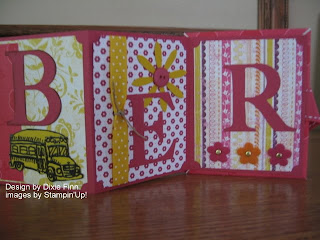 Good morning.  I've had a camera malfunction....I can't find it!!  So I will tell you about the cover.  It is covered with the retired Summer Picnic Designer Paper Red apple pattern.  I've used another of the retired embossed busses and the 1" Rose Red double striped ribbon.  I will have a Halloween banner the end of the month.